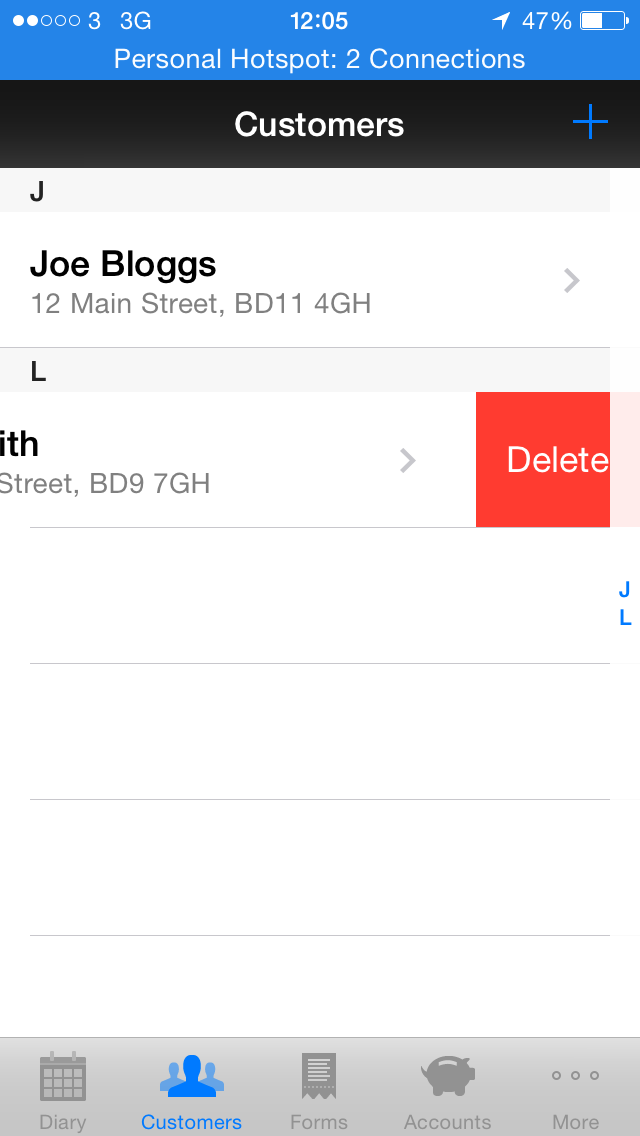 1. From the main customers screen swipe from right to left across the customer you would like to delete.